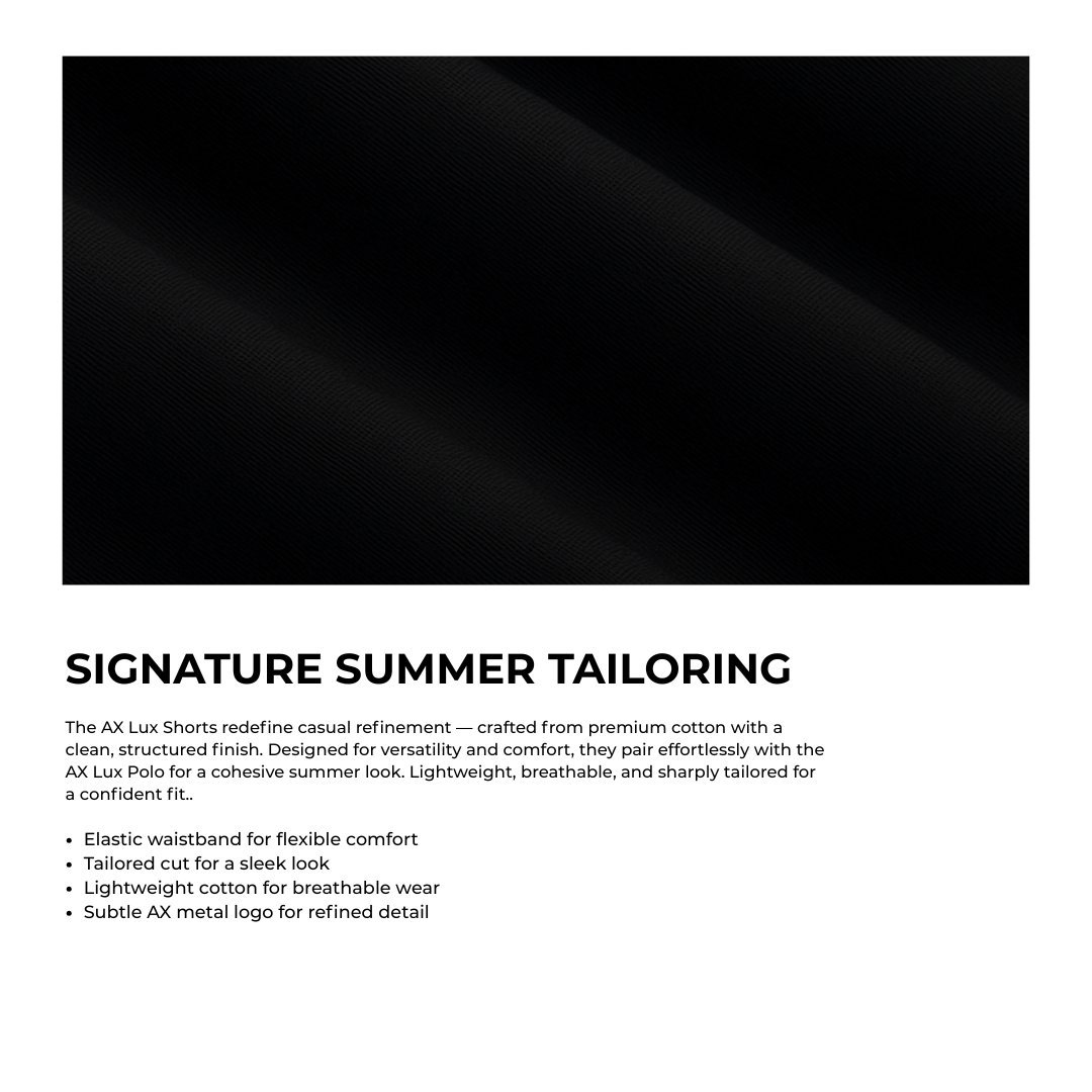 Designed to pair effortlessly with the AX Lux Polo, the AX Lux Shorts bring refined comfort to warm-weather dressing. Crafted from a premium structured cotton blend, they deliver a clean silhouette with a soft yet elevated feel. Complete with subtle metal AX logo detailing, these shorts capture modern minimalism with everyday versatility.