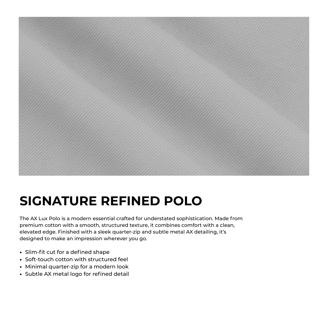 A modern evolution of the classic polo, the AX Lux Polo brings clean sophistication to everyday dressing. Crafted from premium structured cotton with a soft, elevated finish, it features a minimalist metal quarter-zip and the signature AX metal logo detail — a quiet mark of distinction. Tailored for a flattering slim fit, it bridges the gap between casual comfort and timeless style.