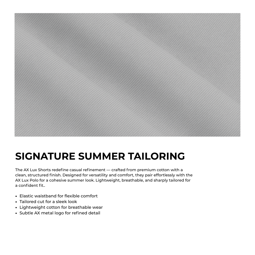 Designed to pair effortlessly with the AX Lux Polo, the AX Lux Shorts bring refined comfort to warm-weather dressing. Crafted from a premium structured cotton blend, they deliver a clean silhouette with a soft yet elevated feel. Complete with subtle metal AX logo detailing, these shorts capture modern minimalism with everyday versatility.